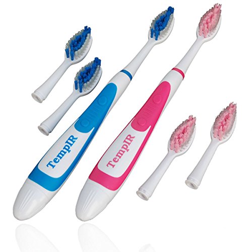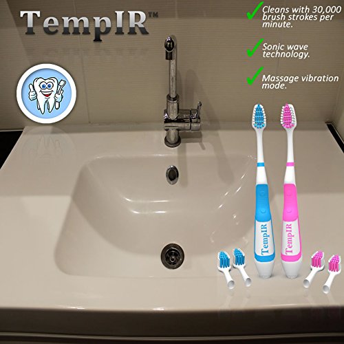 - Feature : Perfect Toothbrush For HOME AND TRAVEL. Save space in your bathroom and travel luggage as NO NEED for a cumbersome Charger. / ** 2 PACK** TempIR proven SONIC WAVE TECHNOLOGY* gives you a customised BRUSHING experience and ULTRA CLEAN TEETH. | SAVE MONEY as batteries last for 100's of uses. Four FREE spare brushheads and batteries included. / Soft and comfortable thorough cleaning for your teeth with the WAVE TYPE BRISTLES. These bristles offer a floss action MICROPULSE that gets between the gaps, removes your dental PLAQUE and BAD BREATH. / MASSAGE VIBRATION MODE for teeth, tongue and gums. 30,000 brush strokes per minute gives tooth-by-tooth brushing, mimicking the brushing motion of a manual brush, but with the ENHANCED BENEFITS OF POWER. / FIRM GRIP BRUSH HANDLE - Ergonomic soft rubber ANTI-SLIP designed handle provides a COMFORTABLE GRIP ideal for children as well as adults. CLEAN YOUR TONGUE and remove bacteria using the specially developed back of the brush head.