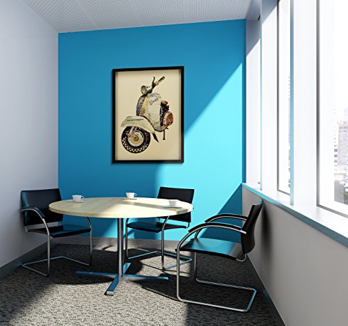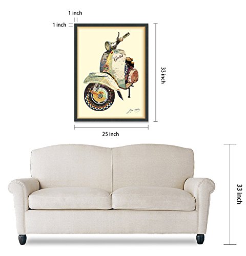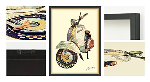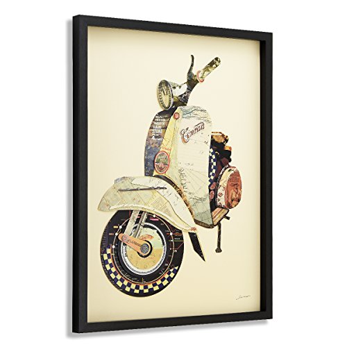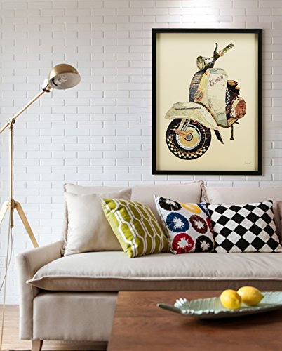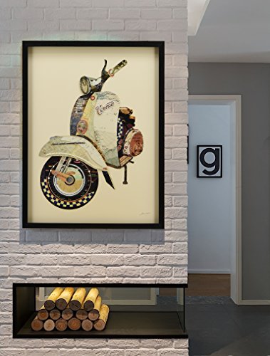 What better way to get around a small town than on a motor scooter. Ideal for a quick ride to shake off the doldrums of the day, the scooter is a fun and practical diversion. This timeless little motorbike is creatively brought to life by Alex Zeng. He uses his art collage training to skillfully bring the image of the scooter to a whole new realm of existence. Because of the layering and dimension, the scooter seems to come right out at you. Add this delightful piece to your art collection.Feature