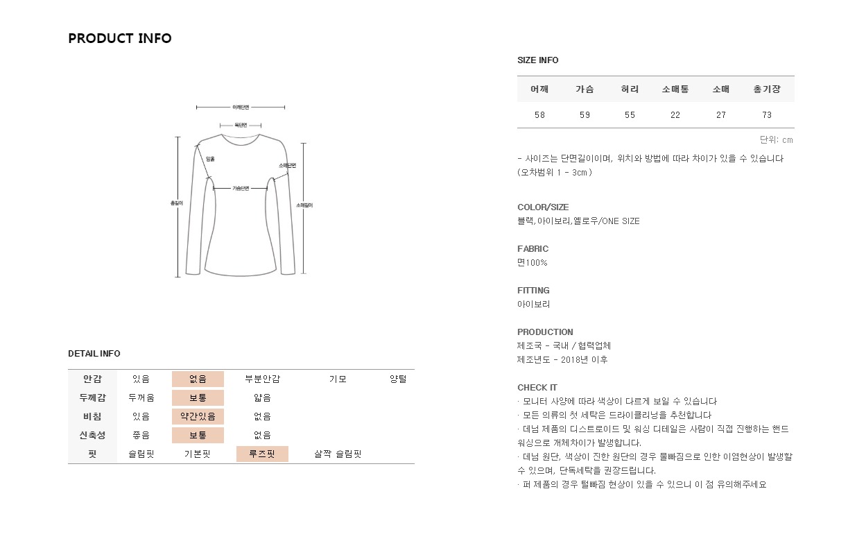 모델이 착용한것처럼 스커트나 데님팬츠 하의와 즐기기좋아요!