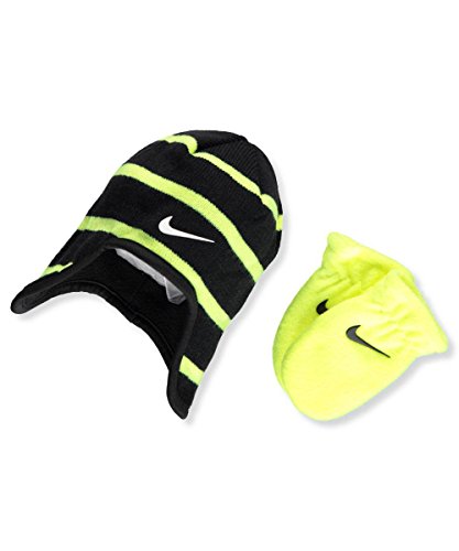 Studio : Nike Publisher : Nike Binding : Apparel Product Description 2-piece beanie and mittens set from Nike. Nike 2-piece beanie and mittens set Acrylic knit earflap beanie with fleece lining (100% acrylic; lining 100% polyester) Fleece thumbless mitts (100% polyester) Hand wash cold Imported 0