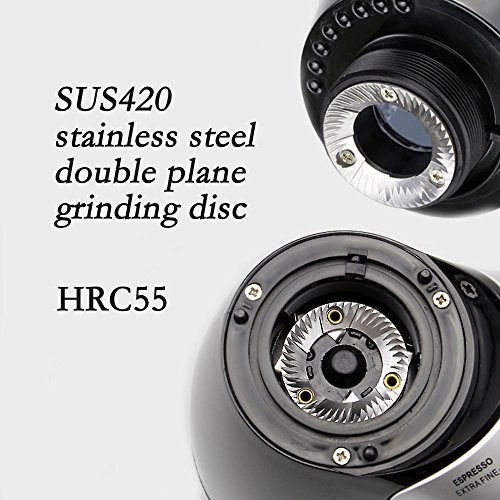 ●High quality material:The burr mill is made of 420 stainless steel,It is hard and sharp,It can grind the coffee beans quickly,Turn the bean cup to adjust the powder thickness
