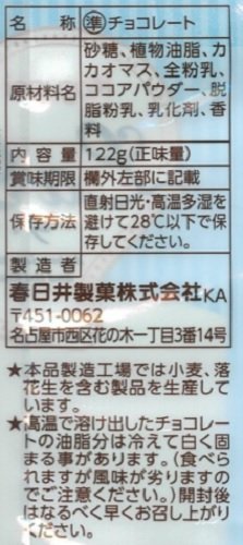 原材料:砂糖、植物油脂、カカオマス、全粉乳、ココアパウダー、脱脂粉乳、乳化剤、香料