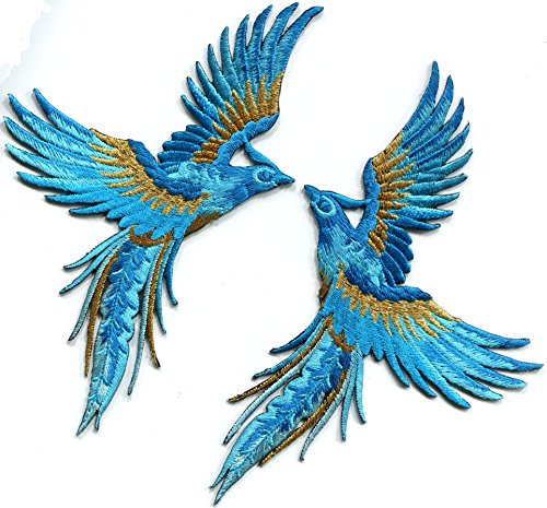 Phoenix phenix birds sky blue sapphire gold embroidered appliques iron-on patches pair S-1337