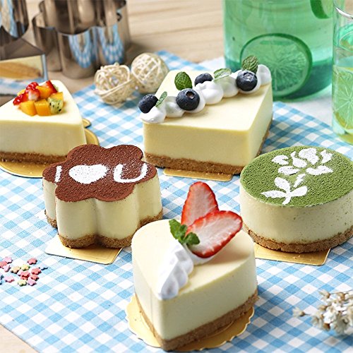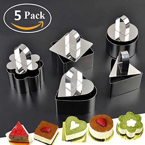 - SET OF 5: 5 different shapes, ideal for creating flower shape, square shape, heart shape, circlce shape, and triangle shape appetizers, molded salads, cakes, mousse and desserts.