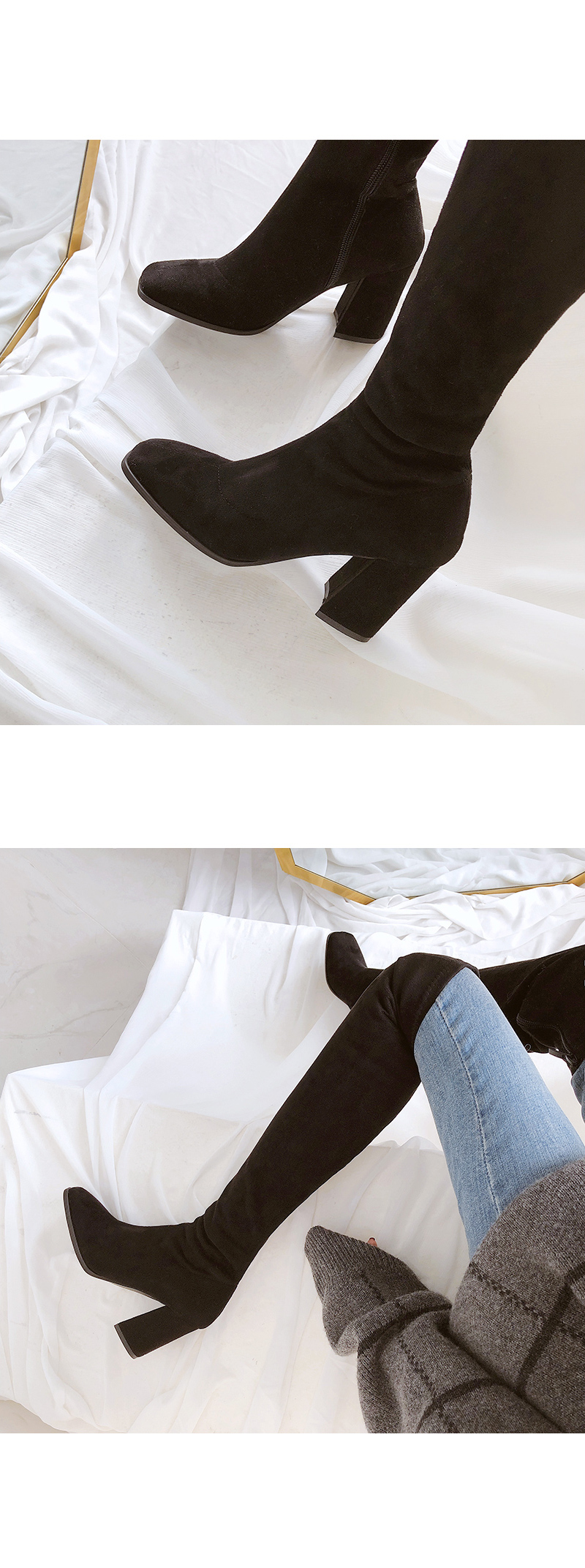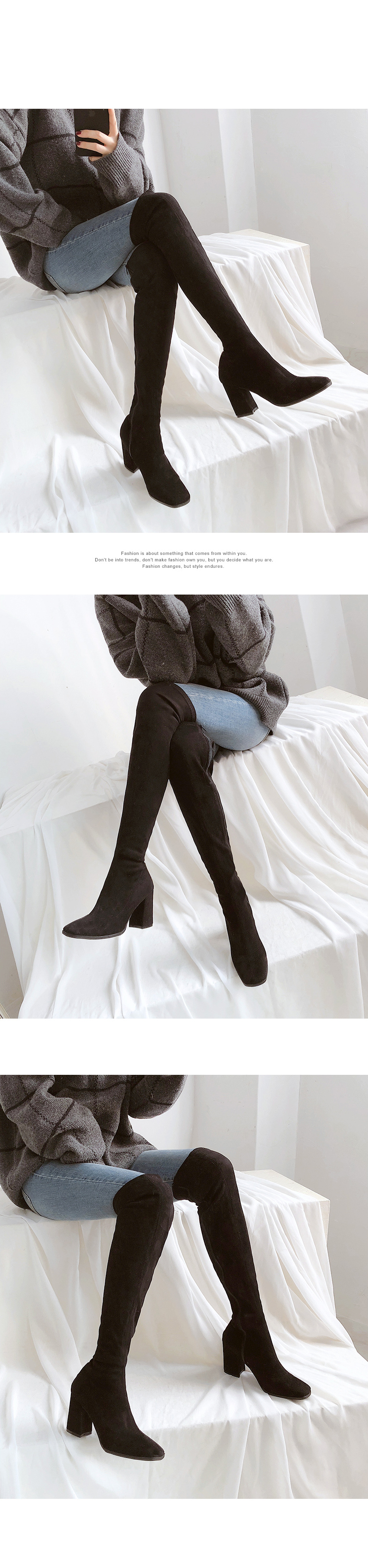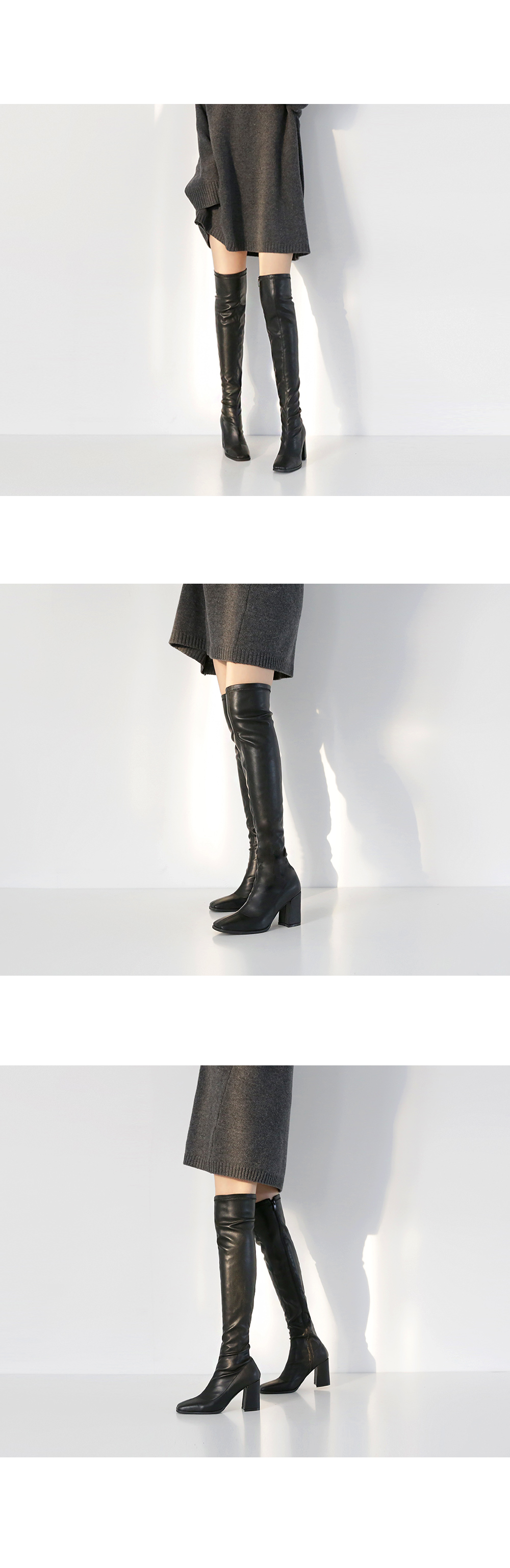 무릎위로 올라오는 니하이디자인이라 미니기장의 니트원피스나 스커트를 매치해서 연출해보길 권해드립니다.