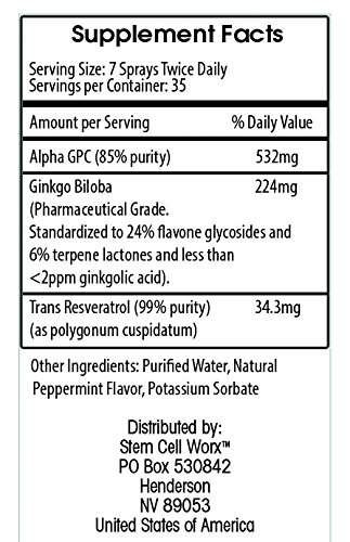 Designed by Bio-Chemists, Brain Cell Worx is the world's only laboratory tested, clinically proven, natural nootropic in an intraoral spray (providing 95% absorption) of its pure, natural ingredients - Alpha GPC (85% purity); Ginkgo Biloba (highest pharmaceutical grade available) and Trans Resveratrol (99% purity). Manufactured in the U.S.A. by a GMP Approved Laboratory that specializes in liquid nootropic supplements. Comes with a money back guarantee.