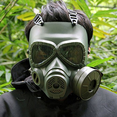 -. Feature : Combination of comfort and protection; Great for cosplay and war game / Built in circulation system. Use 2x AA battery to operate the fan unit which inside the canister unit (not included). / You can put on M04 mask without take off your glasses(not recommended over +4 correction lens) / Adjustable Elastic Strap made of High density nylon, fits nicely on different size of head,keep the mask stable.Cheeck and forehead pad offer a cushion and absorption of energy / Suitable for Airsoft game,CS game(Note:not intended for paintball,be careful of eye protection when using in airsoft),movie shooting, zombine cosplay, masquerade, costume party,Halloween