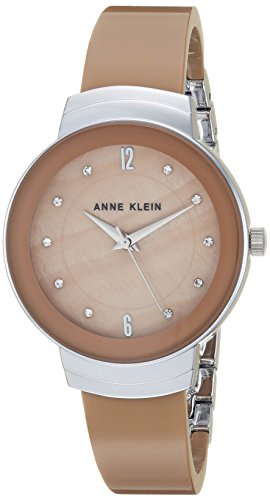 Slightly domed mineral crystal lens; tan mother-of-pearl dial with silver-tone hands and 10 Swarovski crystal accented markers