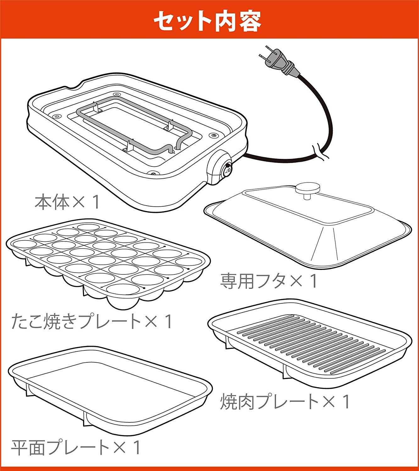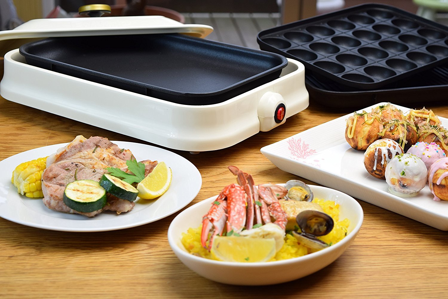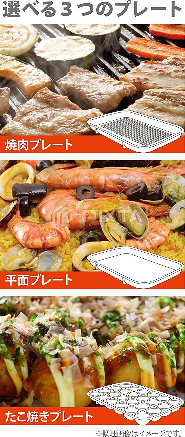 Accessories: Instruction manual (warranty card), Takoyaki Plate (24 holes), Yakiniku plate, Plate plate