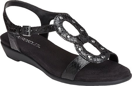 Double loops equal double style in this jazzy sandal. Buckle entry complements the decorative metal studs accenting each ring. Practical 1 covered wedge and flexible rubber sole keep you on the go in comfort.Feature