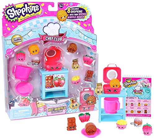 Waffle theme pack includes 8 exclusive Shopkins, waffle maker, small jug, plate, and collectors guide