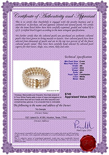 -. Feature : Included FREE with your cultured pearls bracelet is an Appraisal Certificate prepared by a Pearl Expert describing in detail your bracelet size, color and body shape. A color picture of your bracelet is shown on each certificate to ensure carefree insurance claims should those ever arise. It is a wonderful keepsake that shows you truly care. / Create a WOW! Experience with a FREE matching gift box. Our boxes are exclusively designed for PearlsOnly to gently hold your cultured pearl bracelet during shipping and also to be breathtaking when your cultured pearl bracelet is unwrapped and opened. With a focus on detail and elegance, the overall packaging from outside wrapping to inside, creates an unforgettable opening experience. / Easily care for your cultured pearls bracelet, with a FREE silky storage pouch to protect your cultured pearls bracelet when you are not wearing it. Although cultured pearls are very easy to take care off, we do include a FREE Pearl Care Card, so that you can easily know how to best take care of your cultured pearls bracelet to keeps its value and beauty. / We want to be 100% satisfied with your purchase and that is why we offer 30-day returns on all of your purchases. Returns are easy and should you need to return or exchange an item, our customer care team is ready to assist you around the clock. And with a huge selection of Freshwater Cultereed Pearls, Japanese Akoya Cultured Pearls, Saltwater Cultured Pearls, Tahitian Cultured Pearls and SouthSea Cultured Pearls you can find so many things to suit your taste.