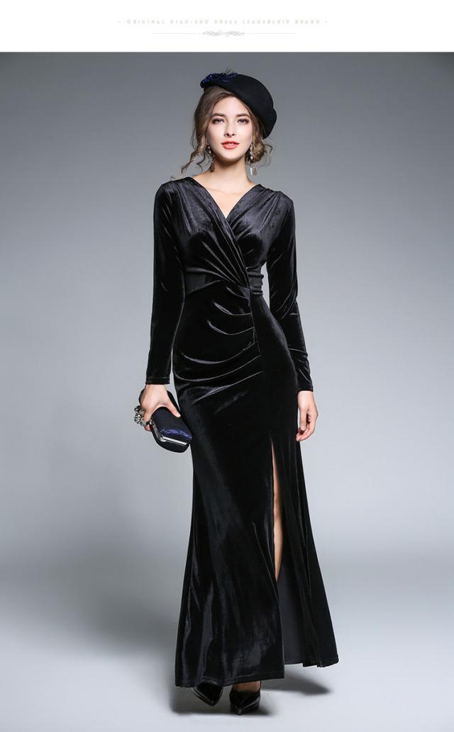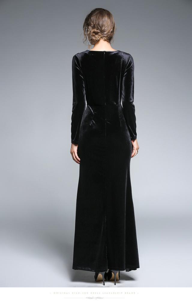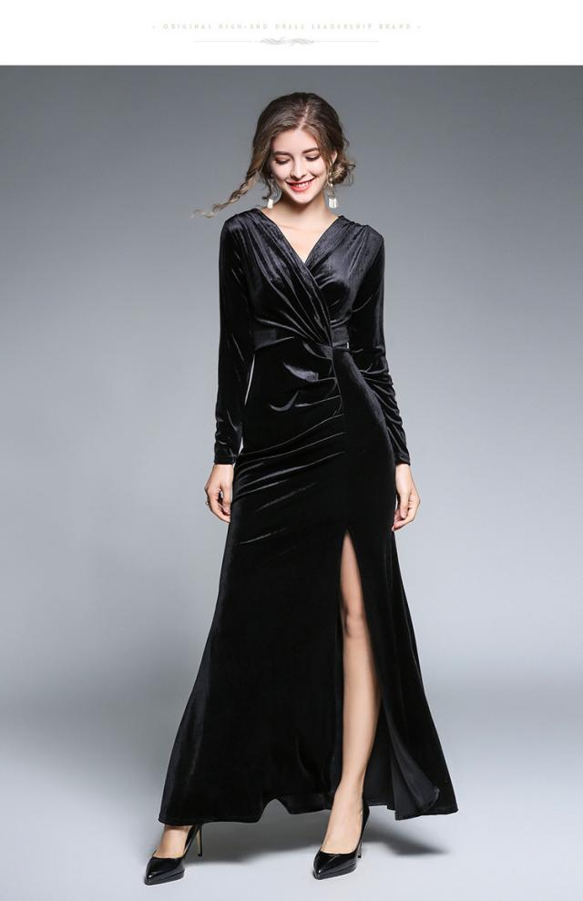 ベロア 前開き ?ネック 長袖 マキシ丈 ドレス ワンピース ディナー パーティー タイトル