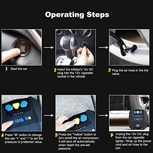 - CONVENIENT AND EASY TO USE - Simply plug 12V DC cigarette lighter plug, connect the included 0.5m hose to the valve, set the desired tire pressure on the LCD screen, turn on and the air pump will automatically shut off at the pre-set pressure