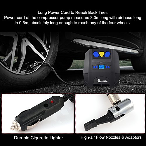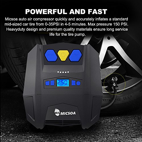 - POWERFUL AND FAST – Micsoa auto air compressor quickly and accurately inflates a standard mid-sized car tire from 0-35PSI in 4-5 minutes. Max pressure 150 PSI. Heavy duty design and premium quality materials ensure long service life for the tire pump