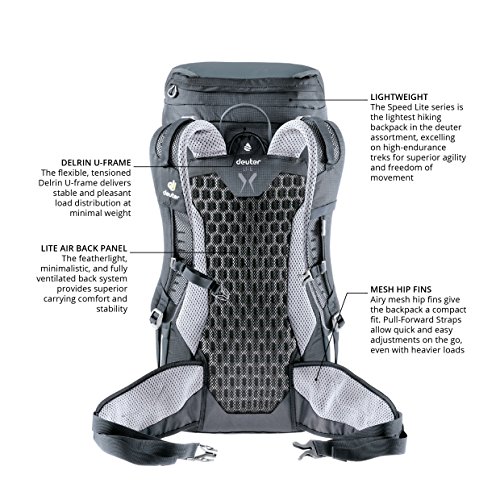 Studio : Deuter Publisher : Deuter Binding : Misc. Product Description The most minimalistic hiking backpack in Deuter's collection, the Speed Lite 24 SL excels in its extreme lightness and puristic design, providing maximum carrying comfort and outstanding ventilation for athletic tours and alpine adventures in challenging terrain. The Lite Air Backsystem is streamlined, breathable, and high-performing, with its flexible and tensioned Delrin U-frame and airy 3D mesh minimizing perspiration and maximizing trail endurance. This hiking pack delivers everything you need and nothing you don't: concealable shoulder harness and hip belt, side compression straps for regulating pack volume, accessory loops for gear attachment, easy finger pull loops on zippers, stretch side water bottle pockets, and hydration system compatibility. The Speed Lites keep backcountry safety in mind with a built-in loop for a safety light, 3M reflectors, and a just-in-case SOS label providing life-saving tips. In its sleek and intelligent design, the Speed Lite 24 SL will over-perform on any elite adventure with such grace and ergonomics that you'll hardly notice it's there. 0