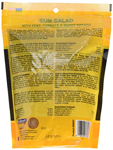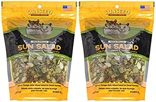-. Binding : Misc. -. Brand : Sunseed Company -. Feature : Natural forage-style mixed salad for dwarf hamsters with peas carrots and sweet potato / This natural high diversity treat encourages active feeding behavior / Great way to treat your pet while supporting overall health and well being -. Label : Sunseed Company -. Manufacturer : Sunseed Company -. MPN : F3BC.79692#VitakraftSaladHamsters-P -. PackageQuantity : 1 -. PartNumber : F3BC.79692#VitakraftSaladHamsters-P -. ProductGroup : Pet Products -. ProductTypeName : PET_SUPPLIES -. Publisher : Sunseed Company -. Studio : Sunseed Company -. Title : Vitakraft Vita P.R.Ima Sun Salad Treat for Dwarf Hamsters 8 oz.