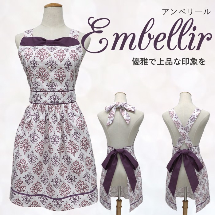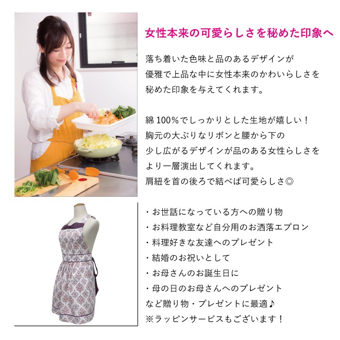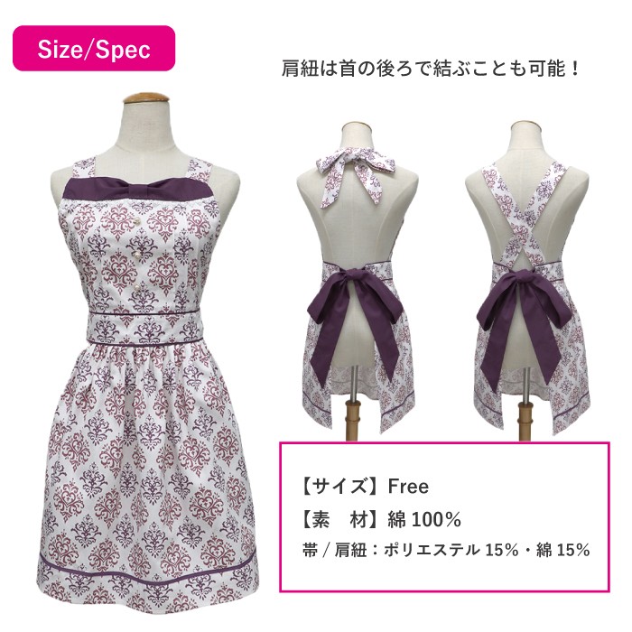 優雅で上品な中に、女性本来の可愛さを秘めた印象を与えてくれる、 人気のアラベスク柄のおしゃれなドレスエプロンです。 ■サイズ フリー 着丈(胸元から裾まで) : 約75cm  ウエスト : 約64cm 腰紐(片側) : 約88cm ■材 質 綿100% 帯 肩紐 : ポリエステル85% 綿15%