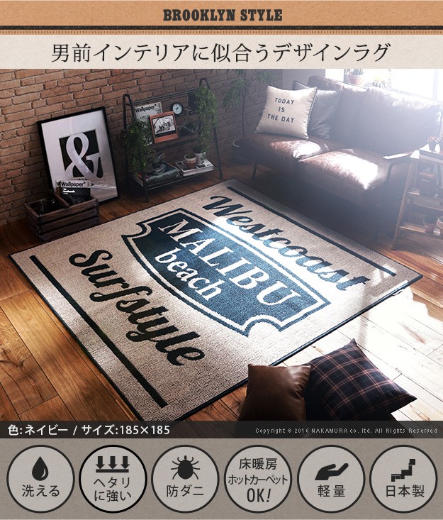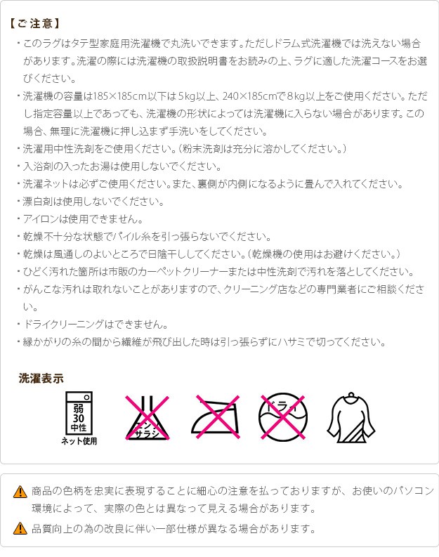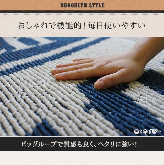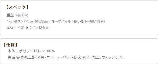 ※メーカー直送のため代金引換はお受けできません。※沖縄・一部離島は別途送料がかかります。お見積もりいたしますのでお問い合わせ下さい。【カラーバリエーション】グレー・ネイビー【仕様】本体:ポリプロピレン100%【サイズ】本体:約240x185cm毛足長さ(ループパイル):約7/3mm重量:約5kg株式会社ナカムラ(33100218)