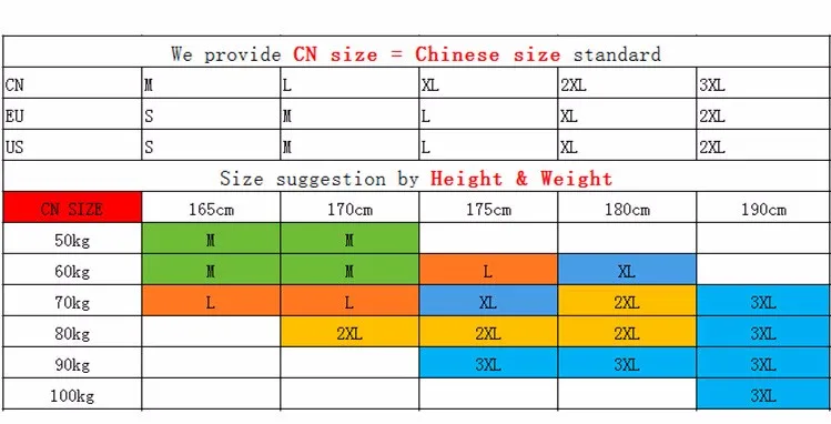 CN size:M,L,XL,XXL,XXXL - 1 size smaller than EU/US size