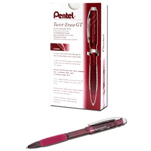 Pentel Twist-Erase GT, 0.5mm, Mechanical Pencil Transparent Burgundy barrel , Box of 12 (QE205B)