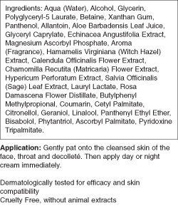 Active Ingredients:Bio-Complex - Synergistic combination of ingredients proven to promote cell renewal Calendula - Calms inflammation and irritation, supports cell renewal Chamomile - Soothes and calms irritation Coneflower - Strengthens resistance to environmental damage Rose Water - Strengthens, has antiseptic properties Sage - Tones, heals, has antiseptic properties Sesame Oil - Replenishes. nourishes, smoothes, and cares for skin Shea Butter - Balances skin, supports cell renewal, smoothes skin St. John's Wort Oil - stimulates cell renewal, firms, refines Witch Hazel - Tones, stimulates, disinfects
