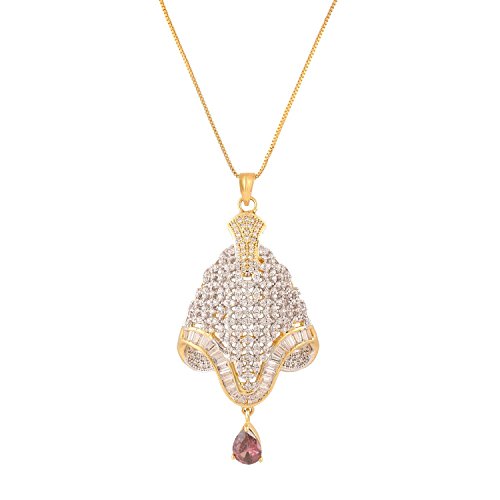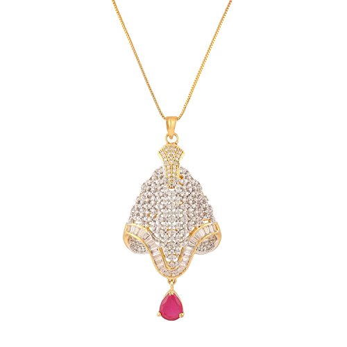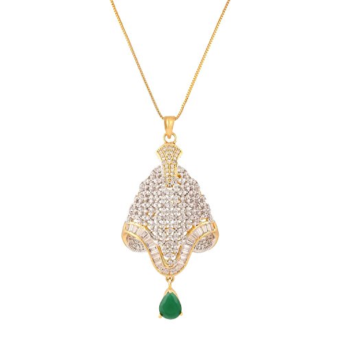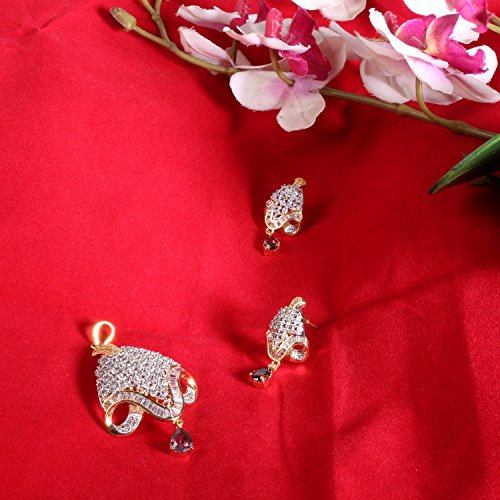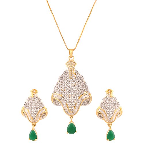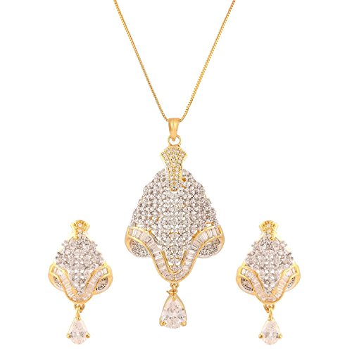 -. Feature : Swasti Jewels Sparkling Zircon Pendant Sets a perfect gift for Every P.R.Incess . Ideal Gift for Loved ones. / Style: A gorgeous beautiful american diamond traditional Pendant Set with matching Earrings. Chain is a part of the Product. / Colors: Gold with American Diamonds and Rhodium Plated. No of Items : 1 Pendant with chain + 1 Pair of Earrings / Styling tip: Wear with an ethnic outfit for any occasion. This traditional set will complement any Indian attire. Ideal Gift for Loved ones, Wife, Mother, Sister. Excellent gift for Birthday, Anniversary, Festivals and Celebrations. / Stone Creation : Simulated ; Stones: Cubic Zirconia & American Diamonds
