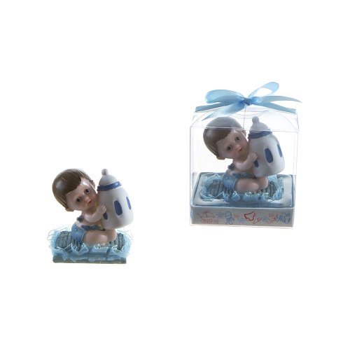 -. Feature : Baby Sitting on Pillow Holding Bottle Favors - Blue, Set of 12 / Baby sitting on a pillow with its edge wrapped with a lace while holding onto a baby bottle / Comes encased in an appealing gift box with clear plastic front and a satin ribbon bow / These favors are designed for gifting right out of the box and will leave an everlasting memory on your guests / Made of Poly Resin