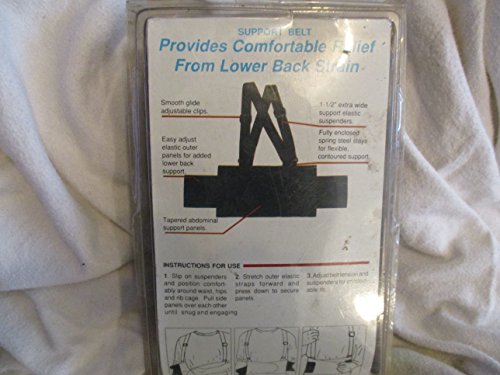 -. Feature : Support belt / Helps to reduce lower back discomfort / Large waist 36"- 47' / 1 1/2" extra wide support elastic suspenders / Tapered abdominal support panes/Smooth ajust elastic outer panels for added lower back support / Fully enclosed sP.R.Ing steel stays for flexible contoured support/Instructions on back of package
