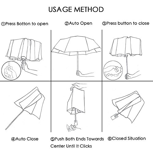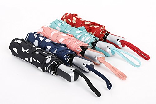 -. Feature : Material: 190T high density water repellent canopy; 8 ribs aluminum frame is ultra-light and is perfect for travel. / Good Grip Handle will automatically opens and closes in seconds. / Stylish polka dots patterned canopy is very cute. / When Opened: Canopy Size: 42.5" ; the diameter:37.4"; Closed Length:11.8" ; Weight:10.93 oz; the folding umbrella is designed to fit in handbags, backpacks, travel totes and the glove compartment of your car. / [1 YEAR WARRANTY] -Send you new piece and no questions asked if anything you are not satisfied with our product or services!