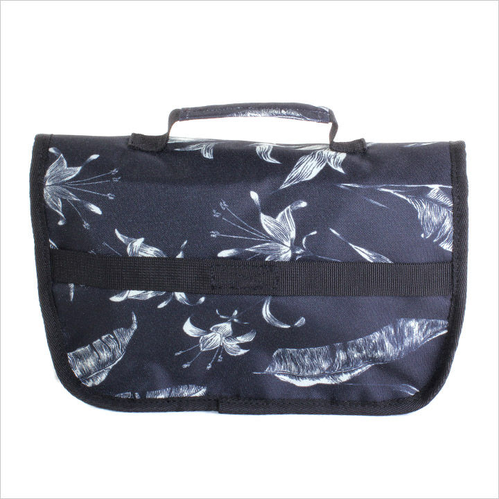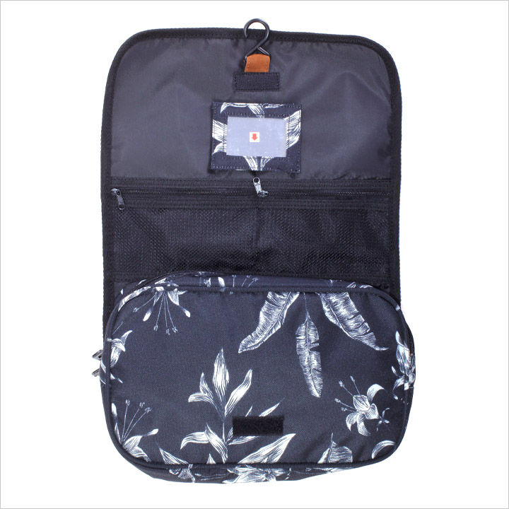耐久性に優れたポリエステル素材の総柄トラベルポーチ。メインコンパートメントは、複数のポケットに加えて、取り外し可能なミニミラーやボトル入れも備えた充実の内装。ハンガーフック付きで、ちょっとした所にかけておけるのもうれしいポイントです。