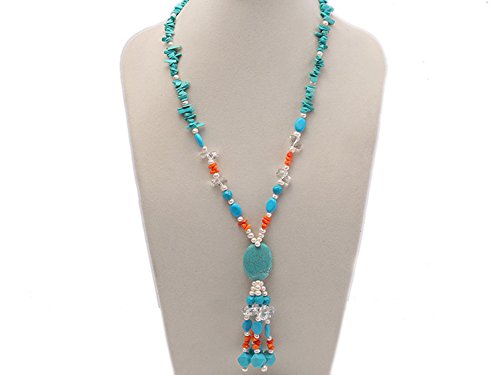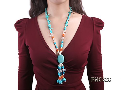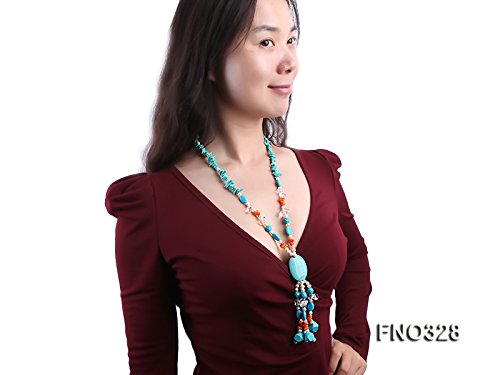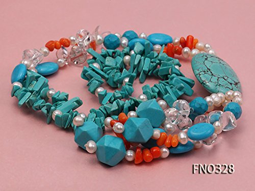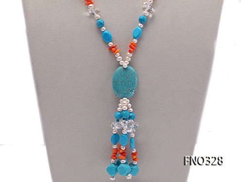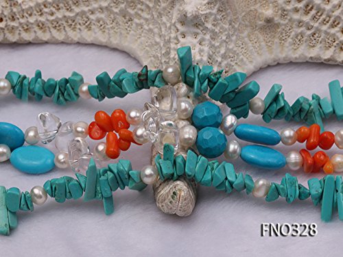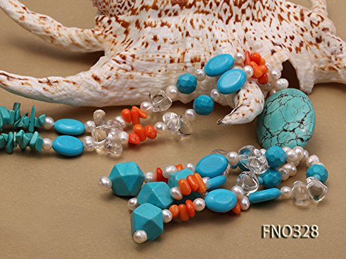 Description *This is a freshwater cultured pearl necklace made with 3x12mm white oval shaped pearls and it is also dotted with some blue irregular turquoise and orange irregular coral beads.