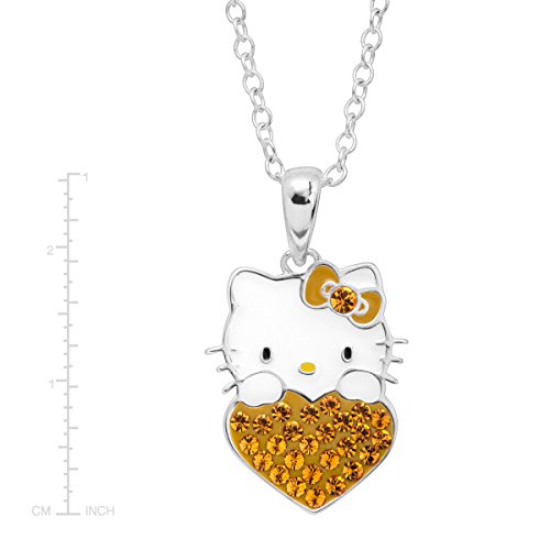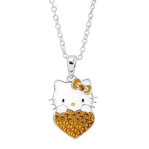 The perfect gift for the November-born in your life! Celebrate with this Hello Kitty heart pendant, crafted in sterling silver-plated brass, featuring round-cut yellow crystals. Piece measures 1 by 5/8 inches. Comes with a sterling silver-plated brass 18-inch cable chain with a spring ring clasp.Feature