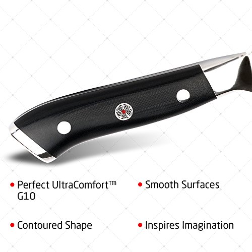 PERFECT GRIP - Comfort, balance, style & elegance describe the Hanzo handle. The military grade G10 sculpted grip along a stainless steel full tang handle is firm & twist free when cutting. The UltraComfortTM design & high polish steel looks & feels great in the hand & the smooth handle surface perfectly meets hand contours for a non-slip hold. Features a beautiful Hanzo 'Red Star' mosaic.