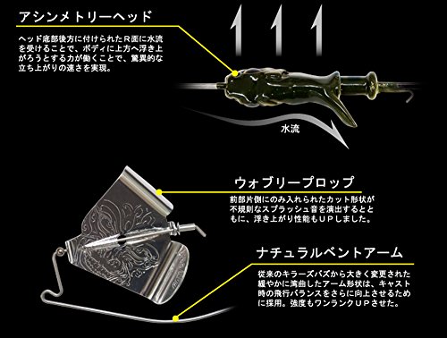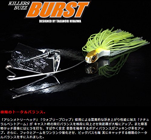 GAN CRAFT/건 크래프트KILLERS BUZZ BURST/킬러의 버즈베이트(Buzzbait) 버스트◆Weight:1/2oz(14g)●헤드 형상은 토탈 밸런스를 UP하기위해 건 크래프트가 개발하도록 한 다음에 하비대칭 형상 하이 포텐셜(potential) 헤드.헤드 상부는 스커트를 감아 올리기 쉬운 형상으로 있기 때문에,캐스트시에 스커트가 프로펠라에 휘감기고, 프로펠라를 잠거 비행 자세를 안정시켜 비거리를 UP 하게 합니다.헤드저 부후방에는 하을 위한의 R을 붙여 수류를 받기 쉬어 하고 있기 때문에 떠올라 성능도 좋고, 장애물 회피 능력으로도 뛰어나 있습니다. 장애물 터치 직후에는《히라》을 치기,민첩하게 안정 자세를 확보하고, hooking율을 UP 하게 합니다.버즈베이트(Buzzbait)의 프로펠라에는 알루미늄 소재를 사용하고, 매혹 물보라라고 파동으로 빅 버스에 어필합니다.