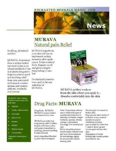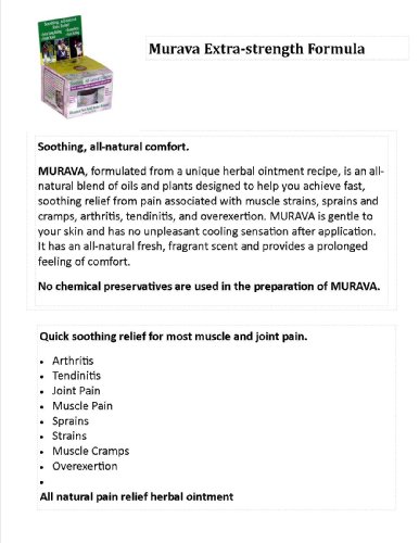 -. Feature : MURAVA - All Natural Pain Relief / * Arthritis * Tendinitis * Joint Pain * Muscle pain * Strains / * Sprains * Muscle Cramps * Overexertion.