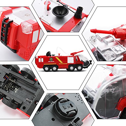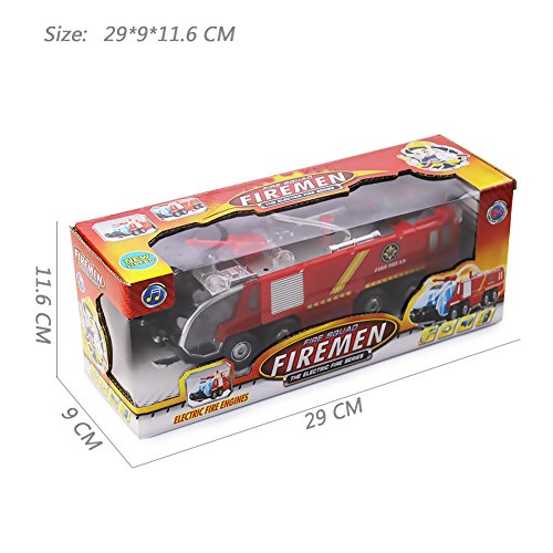 -. Feature : Bump and Go Action emergency fire rescue toy, runs on smooth surface, it can change direction automatically if it bumps into anything / Fire Truck toy with bright flash blue and red lights and sirens sounds,make your kids have a great fun / This truck toy makes you like real,insert water with the filter and squirt water,press the spray button and shot the fire place. / 3 "AA" Batteries Required (not included),recommended for the kids 3 years and up / SIZE - 11.4" L x 3.5" W x 4.5" H.