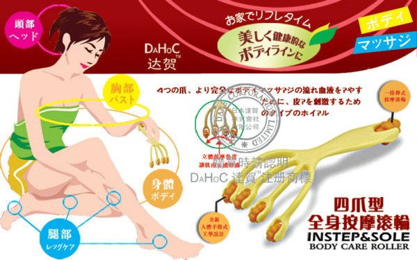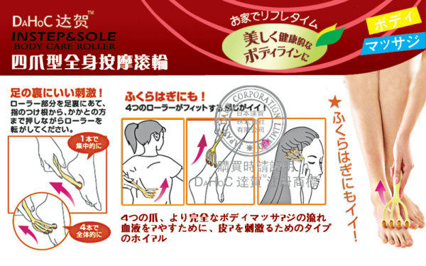 Description : Four claw -type body massage roller , a new concept of massage roller products , body 3D design, appropriate for each part of the body , four claws , from the concept of human fingers , rolling massage , they can simultaneously pressing different the point , thereby enhancing the effects of massage !