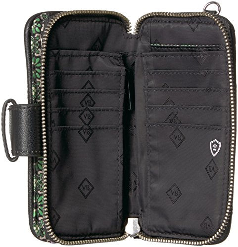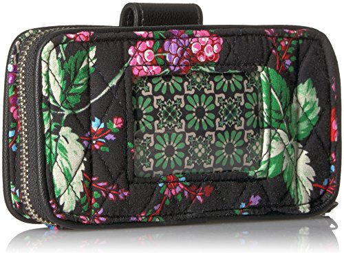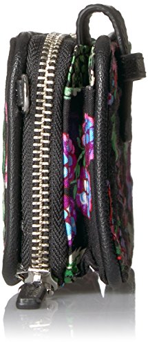 Signature cotton is colorful, lightweight and packable. Provides rfid protection for credit and debit cards. Accommodates an iPhone 6. Phone slip pocket on exterior. Eight credit card slip pockets, one slip pocket, one bill pocket and an id window. Pin snap and zip closures.
