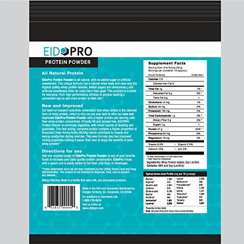 -. Binding : Health and Beauty -. Brand : EidoPro -. Feature : All natural, pure 100% Whey Isolate Protein - more than 27g of protein per serving / No added sugar, no sugar substitute, no artificial flavors. / Fast-acting, easily digested, and quickly absorbed. Gluten-free. / Sourced from Wisconsin-based GRÄN'DE, a grade "A" manufacturer that is endorsed by the American Dairy Products Institute. / Packaged in a durable pouch which is easy to open and reseal. Scoop included. -. Label : Eidogen -. Manufacturer : Eidogen -. PackageQuantity : 1 -. ProductGroup : Health and Beauty -. ProductTypeName : HEALTH_PERSONAL_CARE -. Publisher : Eidogen -. Studio : Eidogen -. Title : 100% Whey Protein