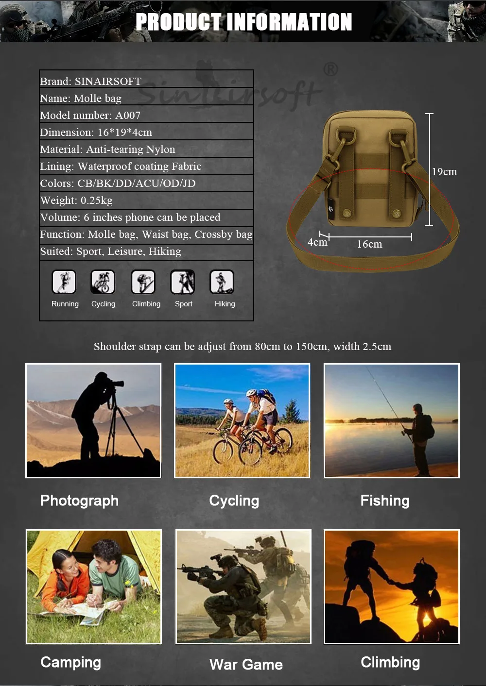Shoulder strap can be adjust from 80cm to 150cm, width 2.5cm