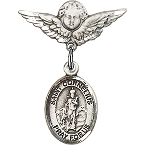 -. Title : Sterling Silver Baby Badge with St. Cornelius Charm and Angel w/Wings Badge Pin 7/8 X 3/4 inches