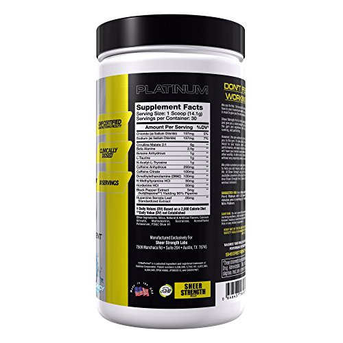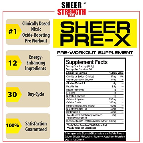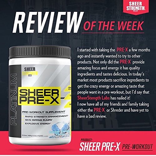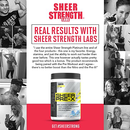 -. Feature : THE ENERGY YOU NEED FOR THE BEST WORKOUTS OF YOUR LIFE: SHEER PRE-X Platinum is made only with 100% safe, proven, and powerful energy-boosting ingredients without any of the junk or fillers found in many pre workout supplements. Each ingredient is clinically dosed to make sure that you get to enjoy their full benefits, making SHEER PRE-X Platinum the #1 best pre workout for men and women looking for an added edge in the gym... / BOOSTS NATURAL ENERGY STORES & NITRIC OXIDE PRODUCTION: SHEER PRE-X Platinum is designed to give you a clean energy lift while also increasing your body's natural nitric oxide levels, which brings increased blood flow and nutrients to your muscles... the result? Enhanced exercise performance, improved energy levels, and decreased post-workout soreness. In other words, it's likely the most powerful and effective pre workout you've ever tried... / ENJOY REAL RESULTS YOU CAN FEEL OR YOUR MONEY BACK: Because Sheer Strength Labs is known for having the purest, highest-quality supplements on the market, we're able to back our products up with a best-in-the-industry 100% money-back guarantee. If you don't love your results with any Sheer Strength Labs product, simply send back even your opened bottle within 30 days and we'll provide you with a fast, hassle-free refund. So hit the 'Add To Cart' button now because your order is 100% risk-free! / PREMIUM QUALITY & PURITY YOU CAN TRUST: Many sports nutrition supplement companies manufacture their products in filthy, unsafe, and untested foreign facilities - unlike them, Sheer Strength Labs proudly manufactures all of our products in state-of-the-art GMP certified facilities in the USA. This is done to guarantee the highest levels of ingredient purity, potency, and safety that Sheer Strength Labs products are known for / THE PLATINUM SERIES DIFFERENCE: Compare the ingredients of Sheer Strength Labs Platinum Series to any other sports supplements on Amazon and you'll discover what so many other thrilled athletes, fitness professionals, and happy customers have: Sheer Strength Labs Platinum Series products might simply be the best, most powerful, and most effective supplements you've ever tried.