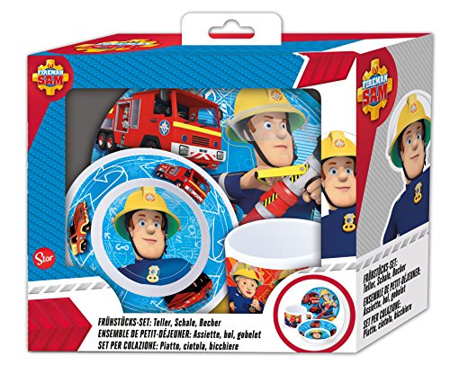 -. Title : Feuerwehrmann Sam Melamin Frühstück-Set 3-teilig im Geschenkkarton mit Sichtfenster Teller Müslischale & Trinkbecher