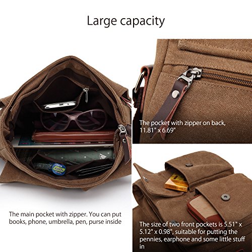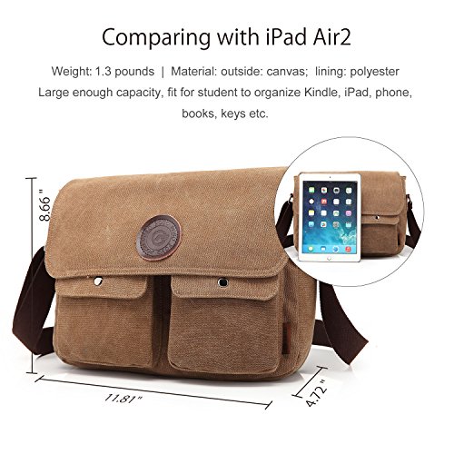 -. Feature : 1, Dimensions: 11.81 x 4.72 x 8.66 inch. Not fit for 13, 14 and 16 inch laptop. ( Warm Tips: there's no padding inside this mens messenger bag, so you should be careful if you put iPad in ) / 2, Material: outside material: canvas; lining: polyester; shoulder straps: cotton cloth; zipper puller: leather. / 3, Various pockets: 1 main compartment, 1 inside zipper pocket, 2 inside little pockets, 1 zipper pocket on back and 3 flip pockets in front. / 4, Exquisite workmanship, superior quality and comfortable wear, it is a nice shoulder bags for school,college, working, shopping, and the daily using, your good choice. / 5, 6 MONTH WARRANTY: This mens shoulder bags have half-year warranty. Any problem please contact us freely, we will solve it ASAP.