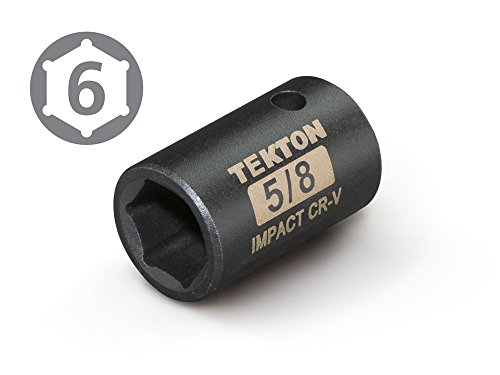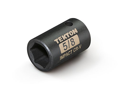 The TEKTON 1/2 in. Drive x 5/8 in. Shallow Impact Socket is engineered for use with impact drivers. It has a 6-point opening that snugly fits the hex shape of fastener heads, allowing it to apply maximum torque without slipping. To prevent round-off under stress, it grips the flat sides of fastener heads rather than the corners. Easy to read even in low light, the large, high-contrast size marking is permanently laser etched into the steel surface. The through-hole in the drive end locks onto the tang of impact wrenches or drivers so it won't fall off or stick on fastener heads. To protect against rust and corrosion, the black phosphate finish absorbs and holds oil, repelling moisture.