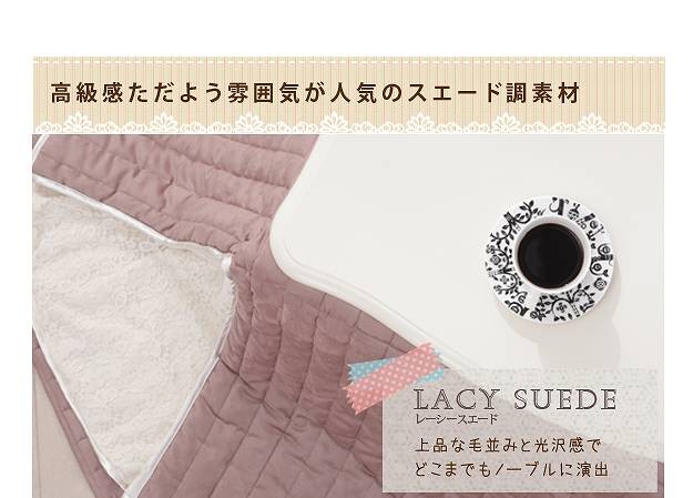 商品について:省スペースタイプのこたつ用掛布団です。肌に直接触れる裏地にはふわふわのシープボア。ベースには起毛加工を施したマイクロスエードの生地でなめらかな肌触りに。コーナー部にはアンティークなレースをあしらってエレガントでガーリーなテイストに仕上げました♪大人可愛いアイテムでお部屋が上品な印象に。お洗濯可能。