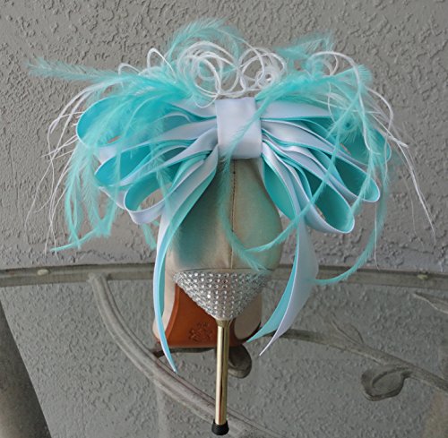 -. Title : Detachable White and Aqua Satin Bow and Feather Shoe Clips. Set of two