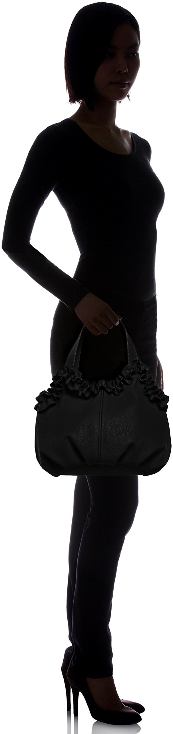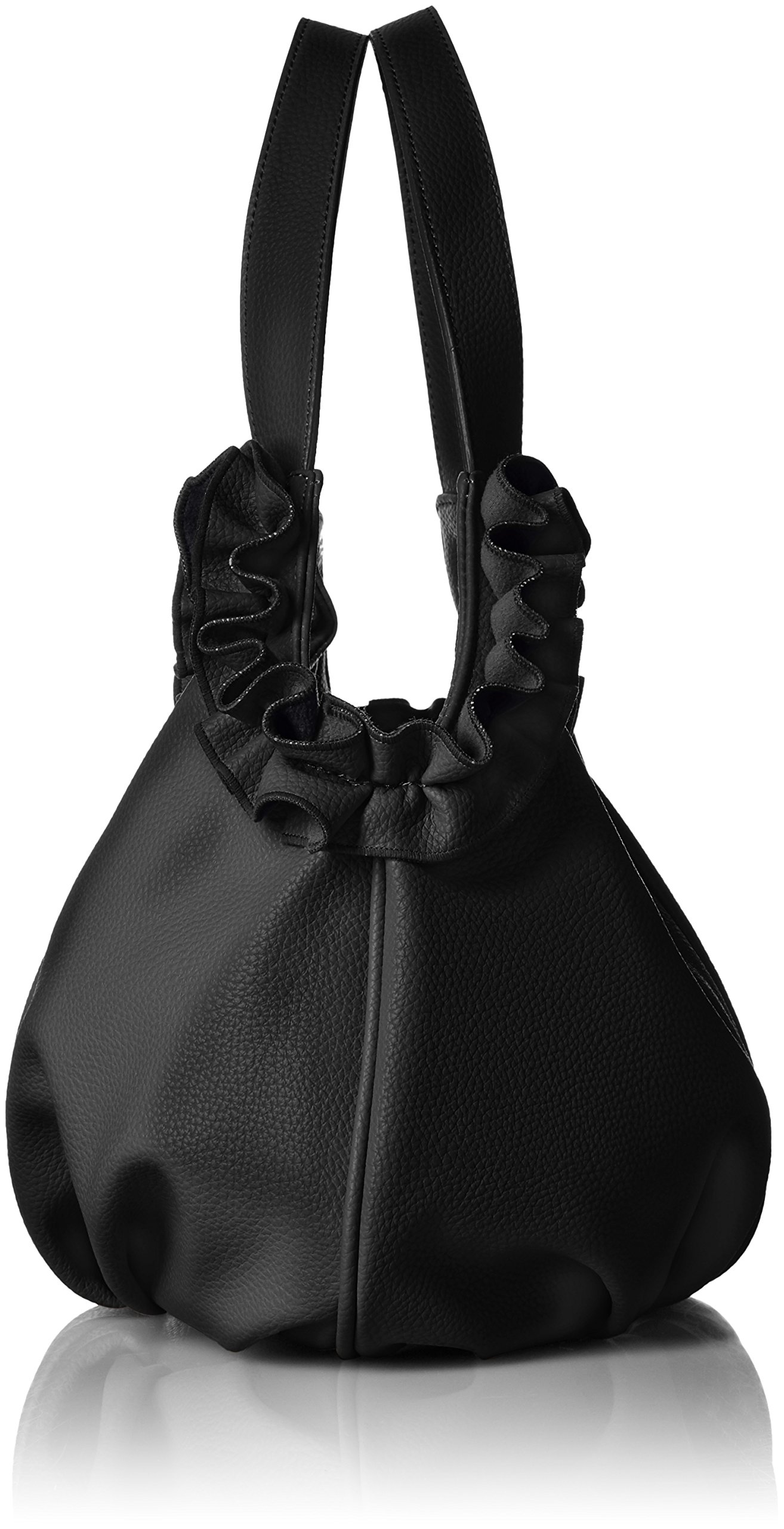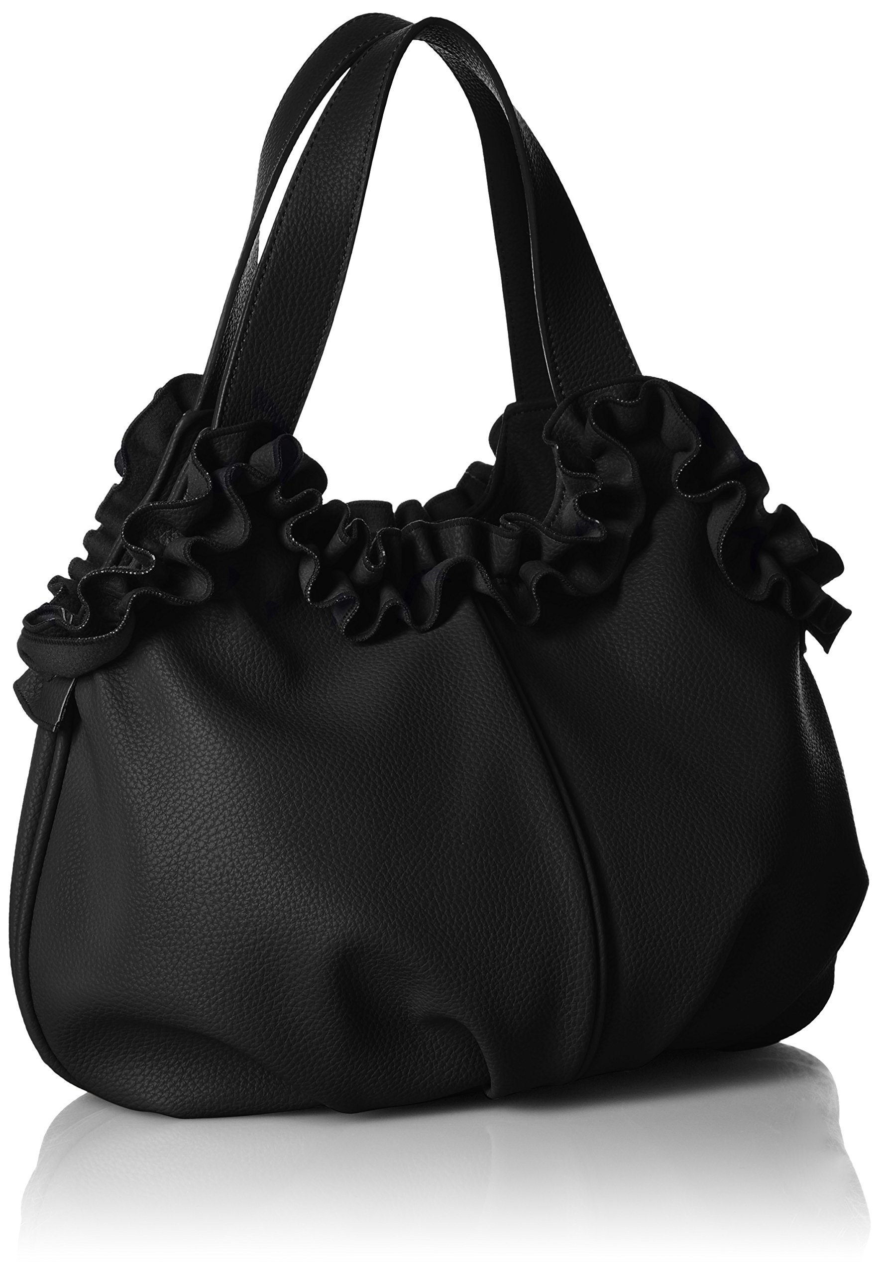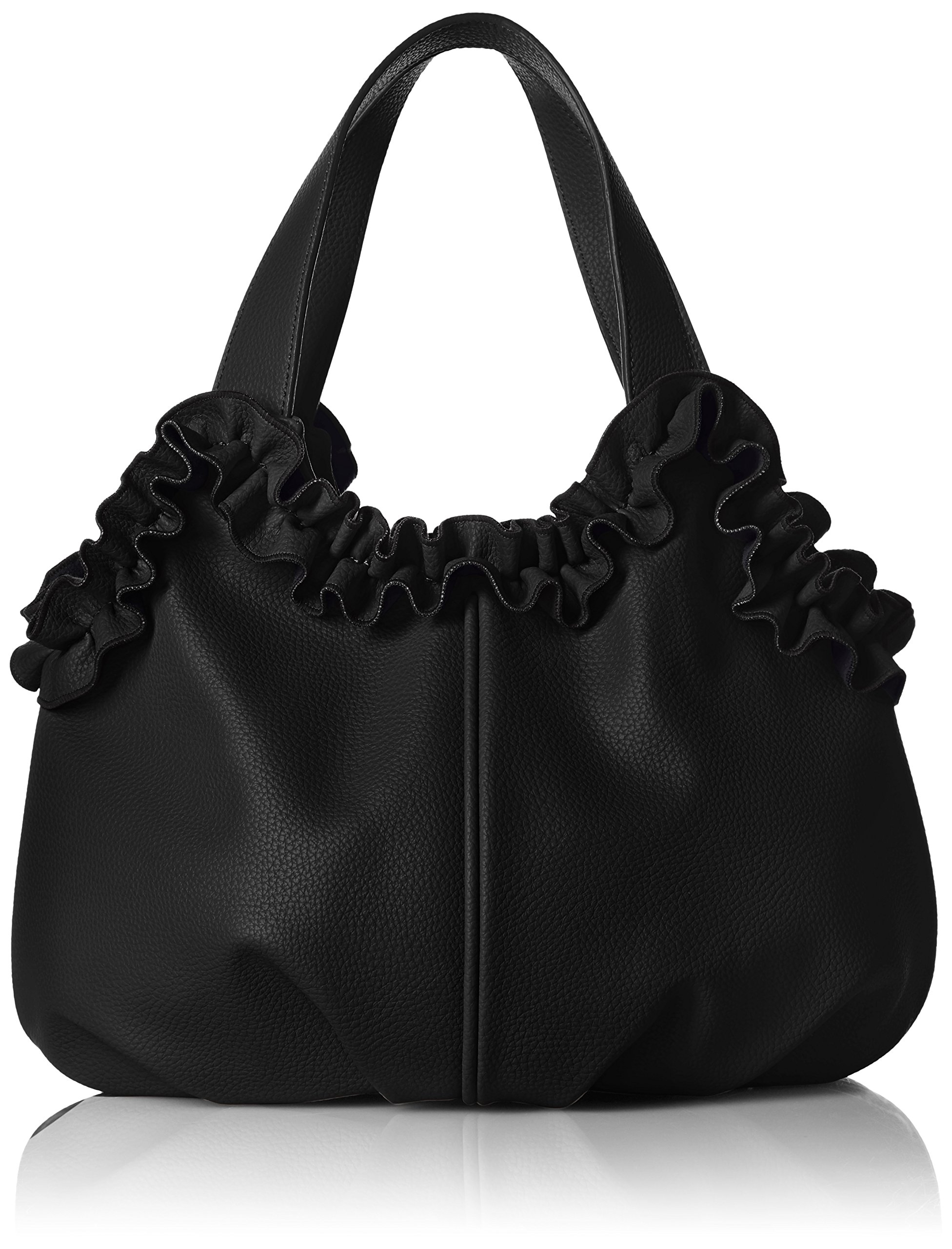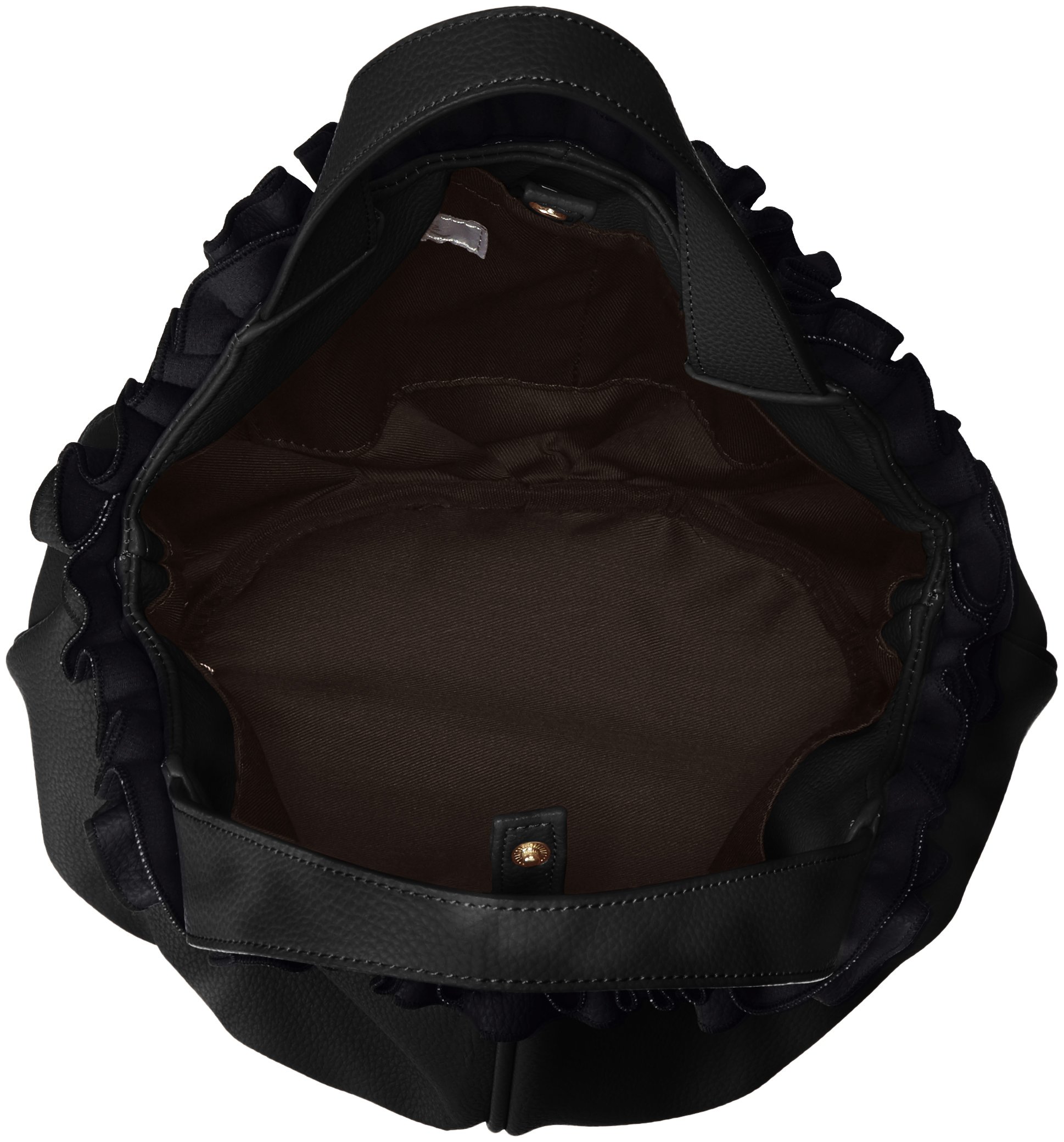 A tote bag with a pretty colored form and ruffled mouth fringes.