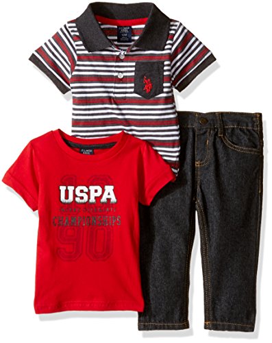 -. Binding : Apparel -. Brand : U.S. Polo Assn. -. Department : baby-boys -. Feature : 3 piece set / P.R.Inted crew neck logo tee / Polo has front button placket, chest pocket, and slit sides / Five pocket denim jean with belt hoops / Each piece features brand logo -. Label : US Polo Assn. Children's Apparel -. Manufacturer : US Polo Assn. Children's Apparel -. Model : 0023 -. PackageQuantity : 1 -. ProductGroup : Apparel -. ProductTypeName : PANTS -. Publisher : US Polo Assn. Children's Apparel -. Studio : US Polo Assn. Children's Apparel -. Title : U.S. Polo Assn. Baby Boys'' 3 Piece T-Shirt, Denim Jean Set